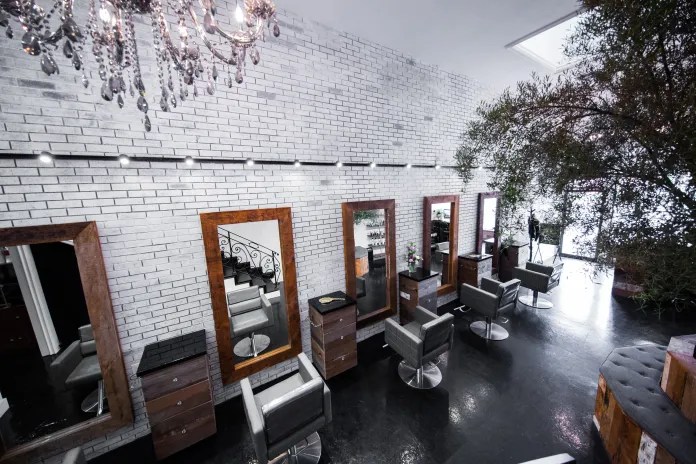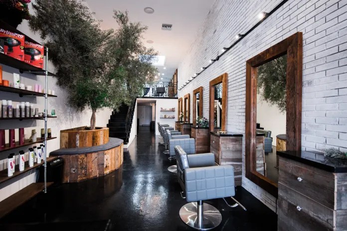 The solid wood structure, thick and dark, lends the mirrors of the Californian Larisa Love Salon and authentic twist. But there is also a surprisingly classic European style. The eye-catching work stations with their roughly hewn, rugged looks lend a sense of solidity and concreteness.